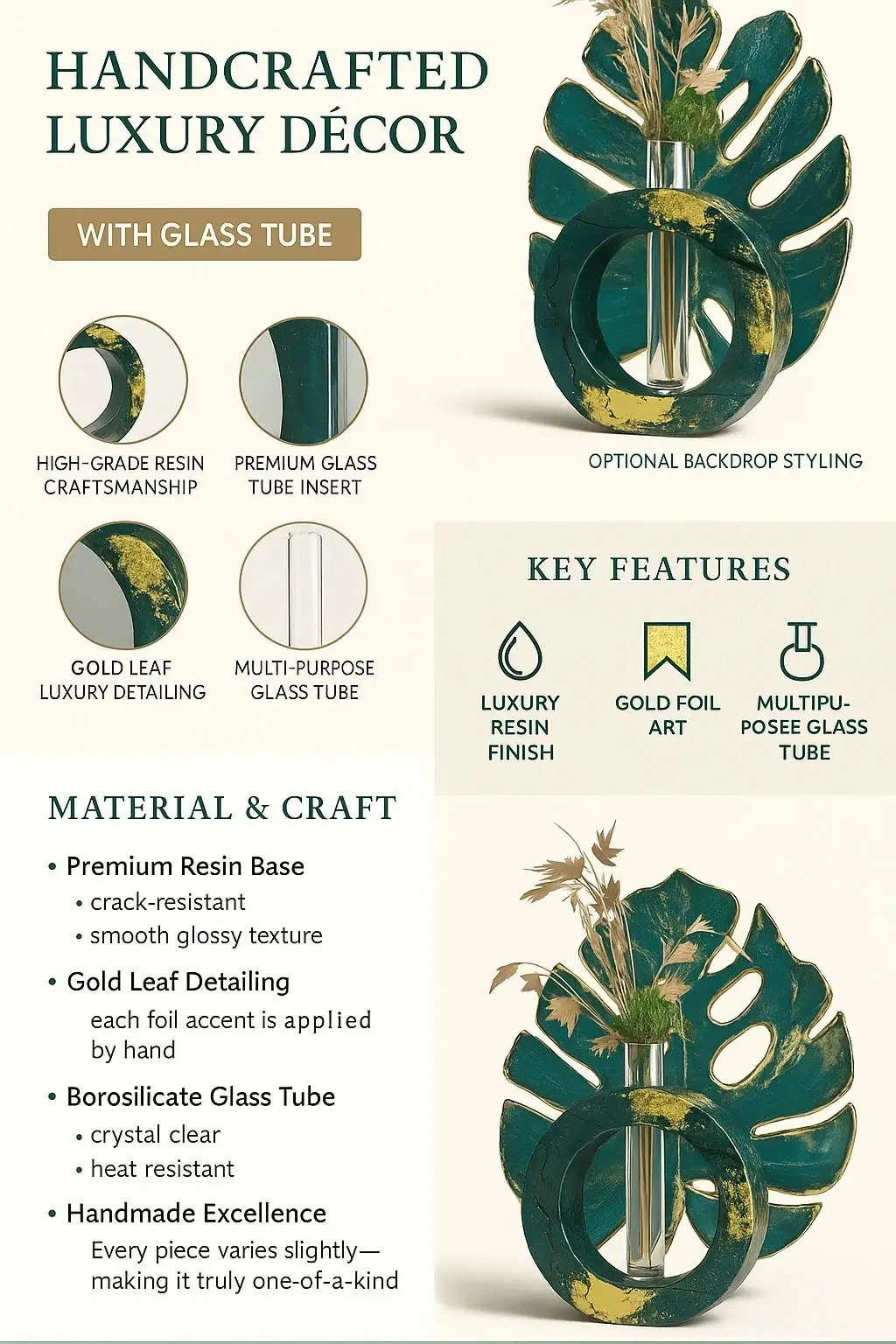 This premium handcrafted vase looks stunning on coffee tables, consoles, office desks, and studio displays. It also works beautifully for dried flowers, pampas, eucalyptus stems, or hydroponic plants. The optional emerald-gold Monstera backdrop adds even more charm and visual depth, making it a true collector’s piece. With its glossy finish, artistic details, and unique handmade texture, this vase turns any corner into a luxury décor moment ✨🌿. ✨ Handmade Luxury Emerald-Gold Ring Vase with Glass Tube | Modern Resin Décor Art Piece 💚🏛️