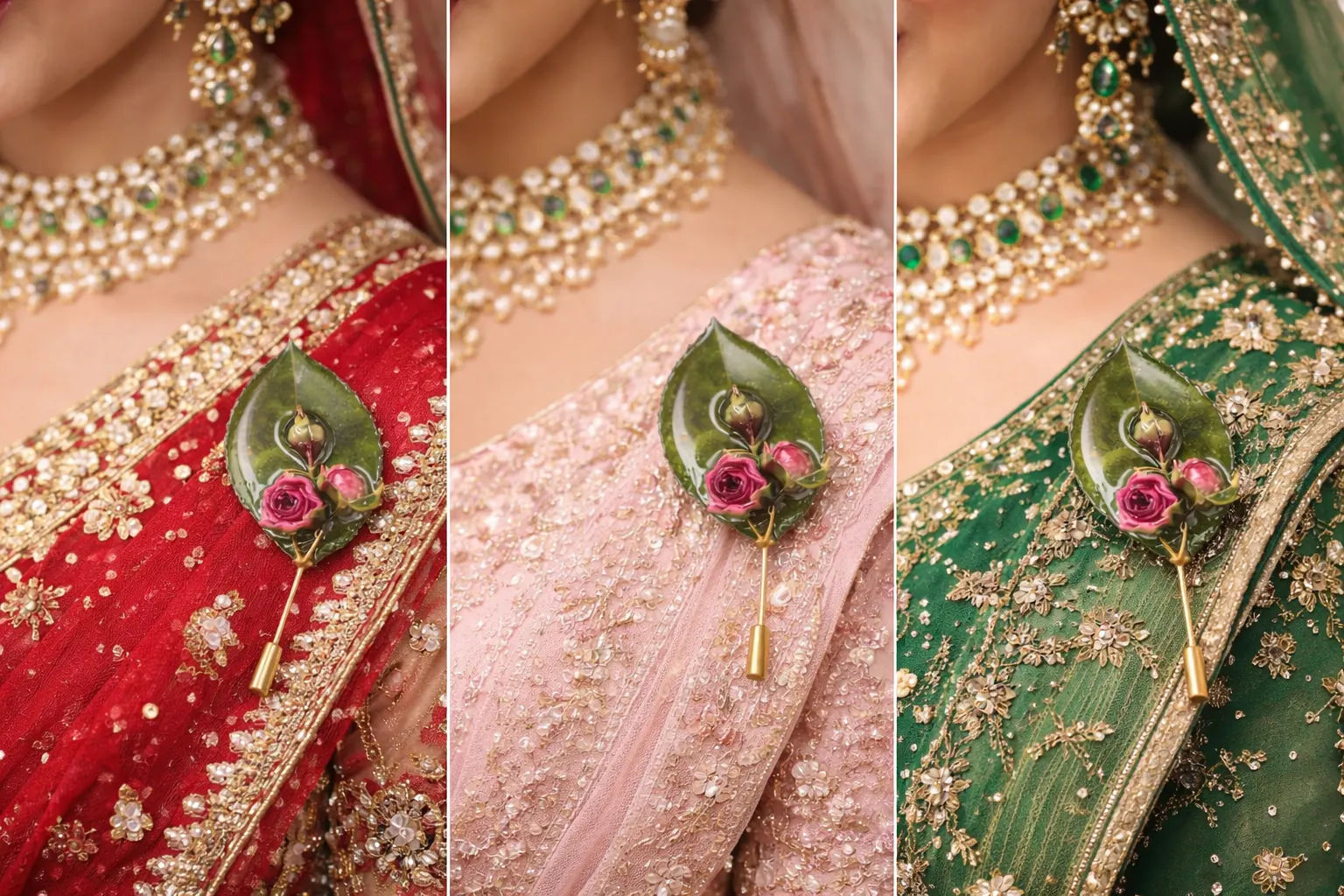 Shop handmade rose blossom leaf resin brooch pin by Bling Onยฎ. A luxury wedding brooch made with real flowers, eco-conscious resin, and premium gold finish. Perfect for bridal wear, gifting, and festive styling. Trending among Indian girls and millennials. Free shipping, secure payments, and quality assurance at blingon.co.in.