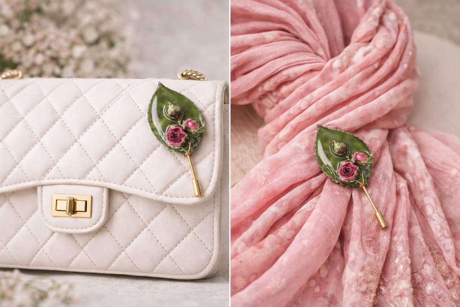 Step into timeless elegance with Bling Onยฎ Handmade Rose Blossom Leaf Resin Brooch Pin ๐นโจโa luxury brooch crafted using real preserved rose buds and a natural green leaf, sealed forever in crystal-clear resin. This handmade jewelry piece is trending across India among Gen Z jewellery lovers, millennials jewellery buyers, Indian girls, craft enthusiasts, and gift buyers who seek meaningful, eco-conscious fashion. Handmade Rose Blossom Leaf Resin Brooch Pin โ Real Flower Encased Nature Jewellery Brooch ๐ฟโจ