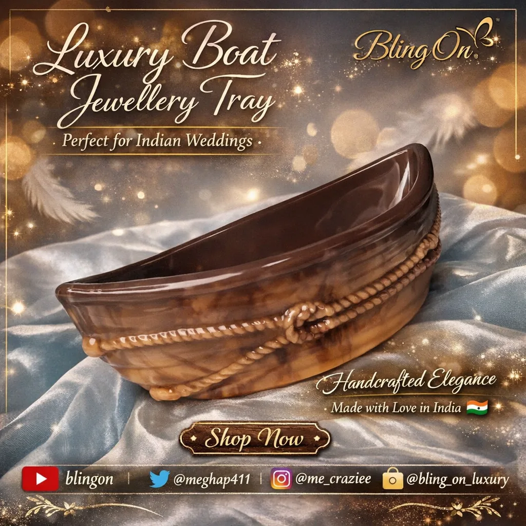 Discover a beautiful handmade boat jewellery tray and trinket holder designed for Indian weddings, Gen Z jewellery lovers, and Millennials. This elegant resin jewelry organizer keeps rings, earrings, bangles, and bridal accessories organized while enhancing your vanity decor. Perfect for Indian bridal dressing tables, wedding jewellery styling, and luxury gifting, this premium handmade tray from Bling Onยฎ blends artistry with functionality. Shop now for stylish handmade jewellery organizers with free shipping across India.