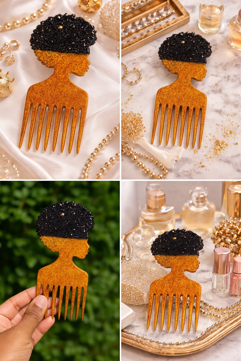 The Afro Girl Resin Hair Pick Comb is a handmade black and gold wide tooth luxury hair accessory designed for women with curly and textured hair. Crafted from premium epoxy resin, it offers gentle styling, root lift, and statement beauty appeal while doubling as a vanity dรฉcor piece and gift item.