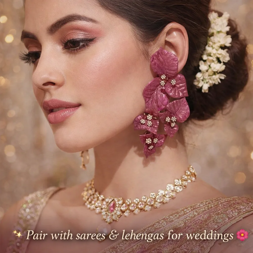 handmade floral statement earrings,bougainvillea resin earrings, luxury resin jewellery india, party wear earrings for women, bling on handmade earrings, sexy jewellery for indian girls, lightweight statement earrings, premium festive jewellery india, crystal floral earrings, viral trending jewellery india