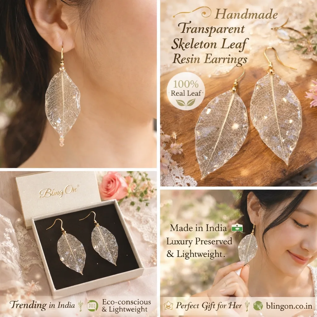 India no 1 handmade jewellery,ย Transparent skeleton leaf earrings,ย Handmade resin jewellery India,ย Gen Z jewellery trending,ย Luxury handmade earrings, Eco conscious resin jewelry, Viral jewellery India,ย Customizable handmade gifts, Nature inspired jewellery, Bling on luxury jewellery
