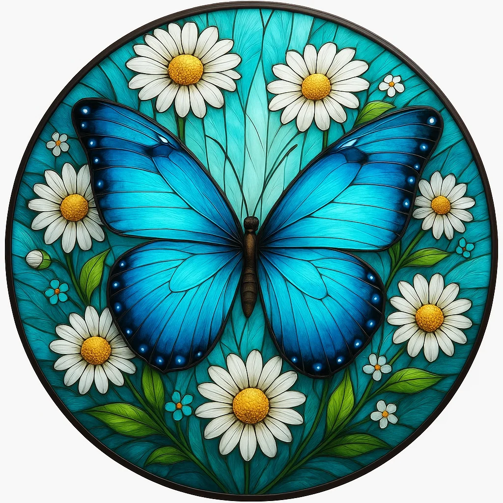 This set brings light and beauty into your home. The blue butterfly feels energetic and refreshing, while the daisy flowers create a warm, friendly feel. Although the print looks like stained glass, it is fully digitally printed for long-lasting clarity. The resin top makes it glossy and elegant, and each coaster looks beautiful in daylight or soft evening light 😊✨.