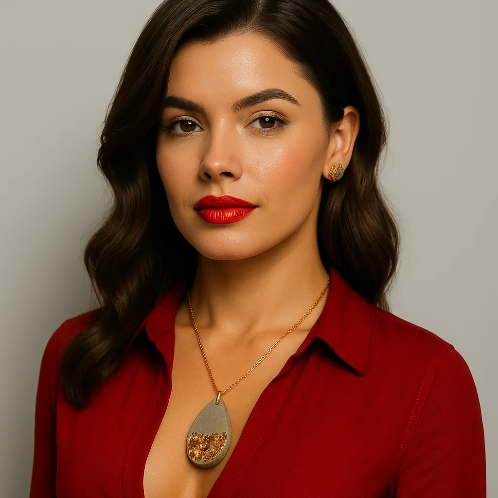 This elegant combo features a stunning Teardrop Pendant paired with Round Stud Earrings, both handcrafted from concrete and embellished with premium copper foil for a luxury touch. 🌿