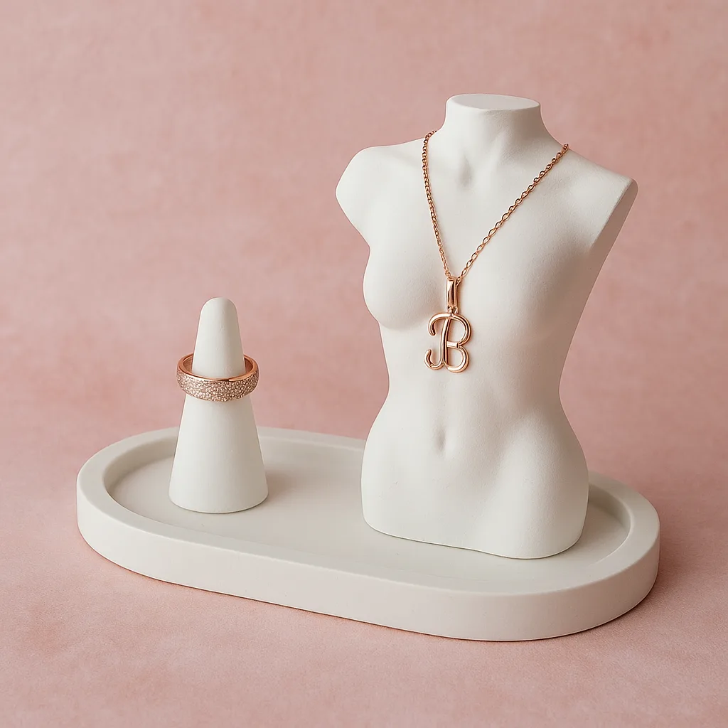 Discover Bling On®’s Luxury White Handmade Jewellery Set featuring a marble-white tray, sculpted torso pendant stand, and minimal cone ring holder. Fully customizable for weddings, décor themes, sherwani colors, vanity styling, and gifting. Perfect for Gen Z, Millennials, creators, and décor lovers. Premium resin craftsmanship, proudly handmade in India.