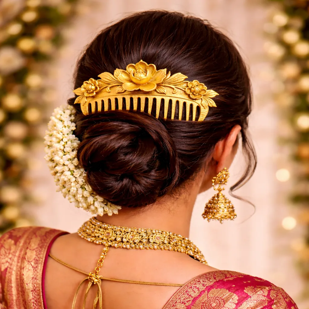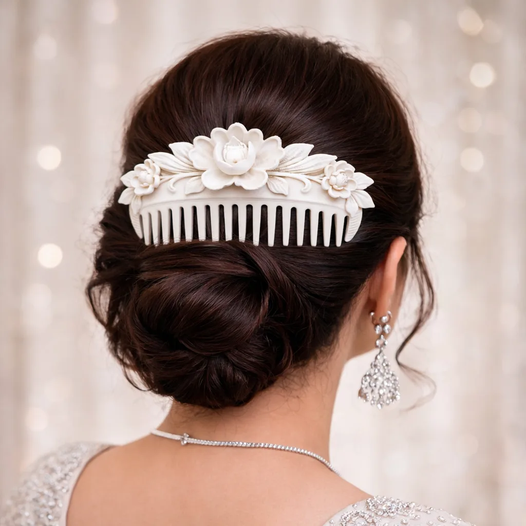 handmade resin hair comb, Indian bridal bun accessory, custom color wedding comb, matte finish floral comb, unique handmade jewelry India, golden bun hair pin, white resin hair accessory, silver festive comb, artisan made hair jewelry, luxury bridal accessory, Indian handmade brand, resin wedding accessory, custom bridal gift India, boutique hair jewelry, statement bun comb