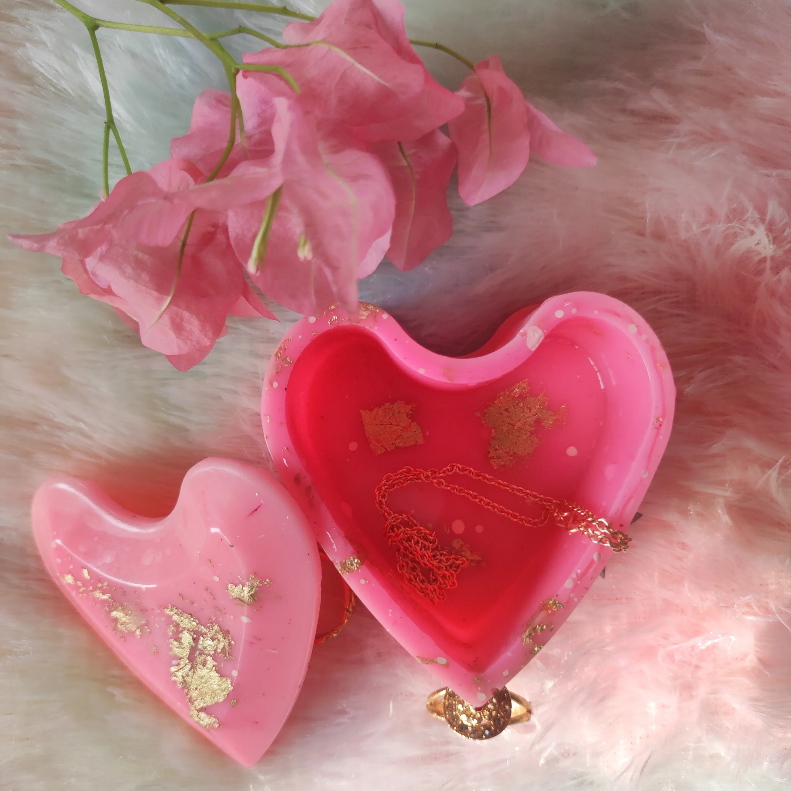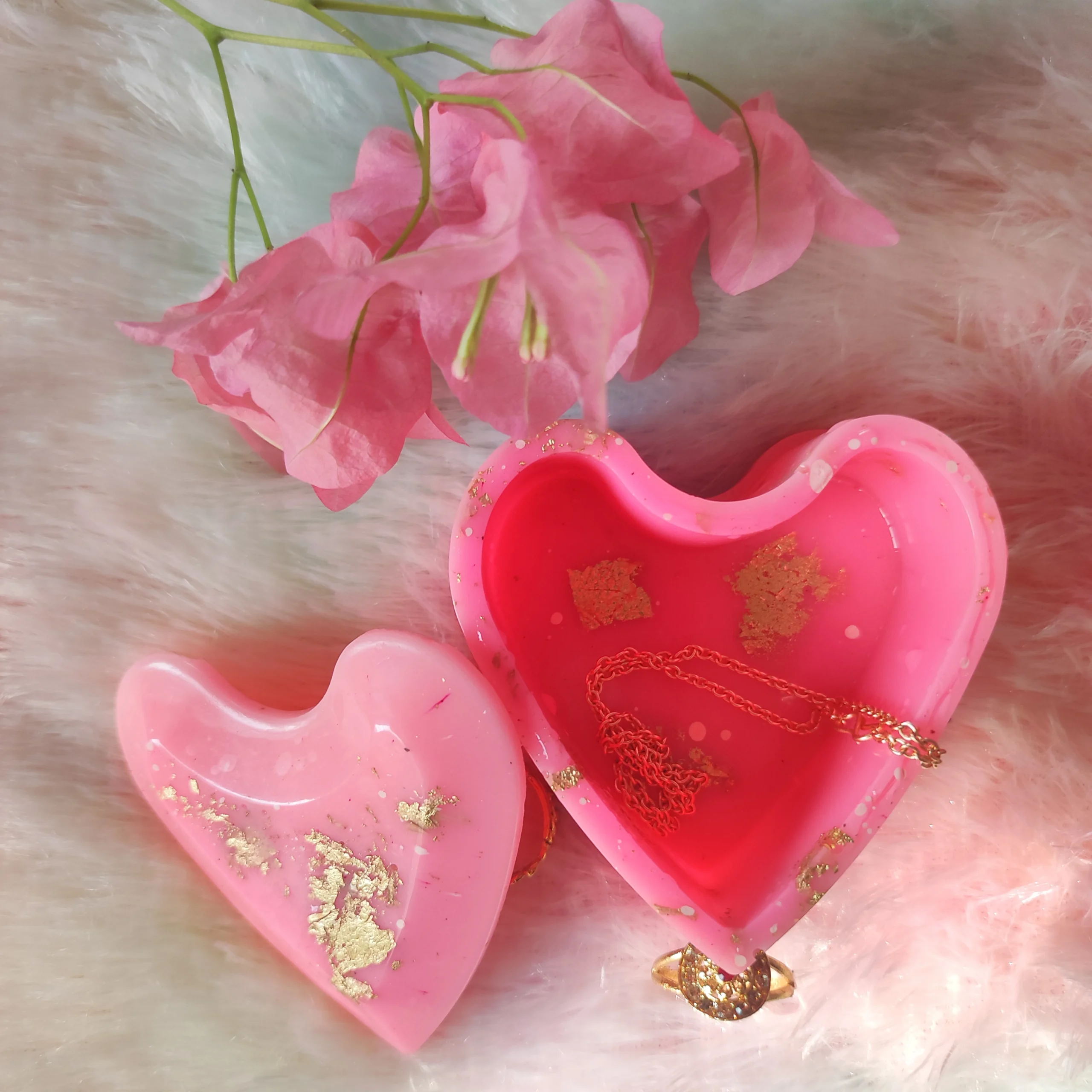 This Handmade Resin Heart Jewellery Box is crafted with love, care and pure emotion 💗😊. Designed in a soft pink glossy finish with floating gold flakes, it is perfect for storing rings, chains, earrings, charms, love notes and keepsakes.