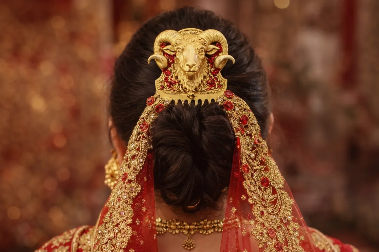 Handmade zodiac resin hair comb,Bridal golden hair accessory India,Matte finish zodiac hair pin, Aries ram bridal hair comb.,Vintage royal bridal hair jewelry, Astrology inspired hair accessory, Luxury resin bridal hair comb, Red and gold wedding hair accessory, Statement bridal hair comb India,