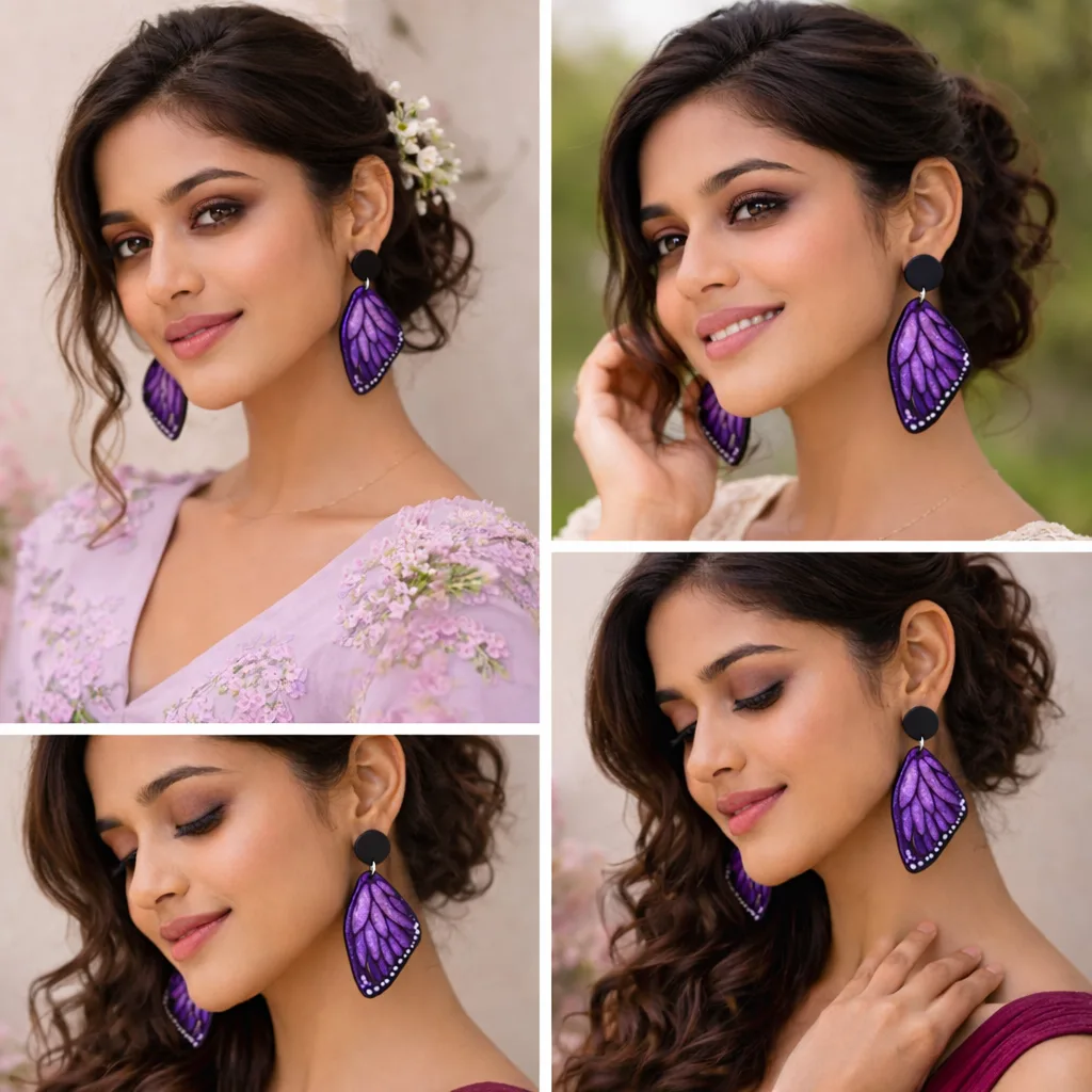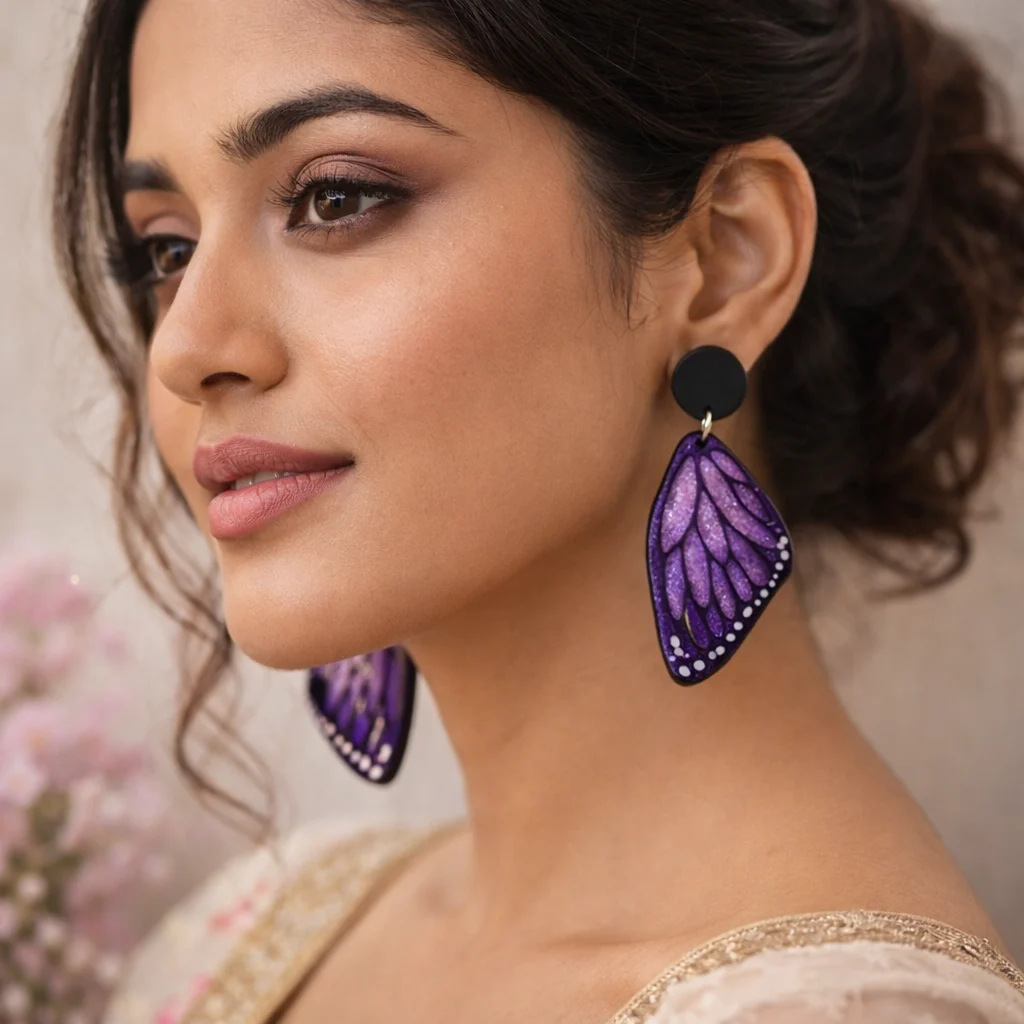 Each piece is meticulously handcrafted using premium resin, polymer clay, and jesmonite, delivering a luxurious finish with a feather-light feel 💎. The subtle shimmer, gradient purple tones, and wing-inspired detailing reflect both nature’s beauty and artisan mastery, making them ideal for everything from daily glam to statement occasions.
