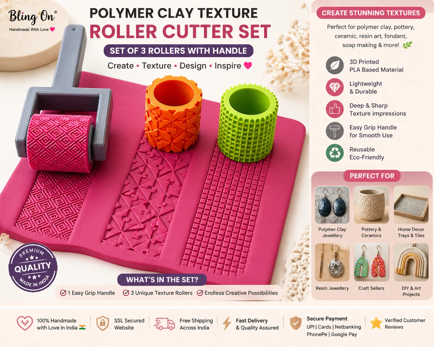 Buy bright color Polymer Clay Texture Roller Cutter Set from Bling Onยฎ. Premium 3D printed PLA craft tools for polymer clay jewellery, pottery, resin jewellery, home decor and DIY crafts. Reusable, lightweight and easy to use with stylish bright colors. Perfect for creators and handmade businesses. Free shipping across India.