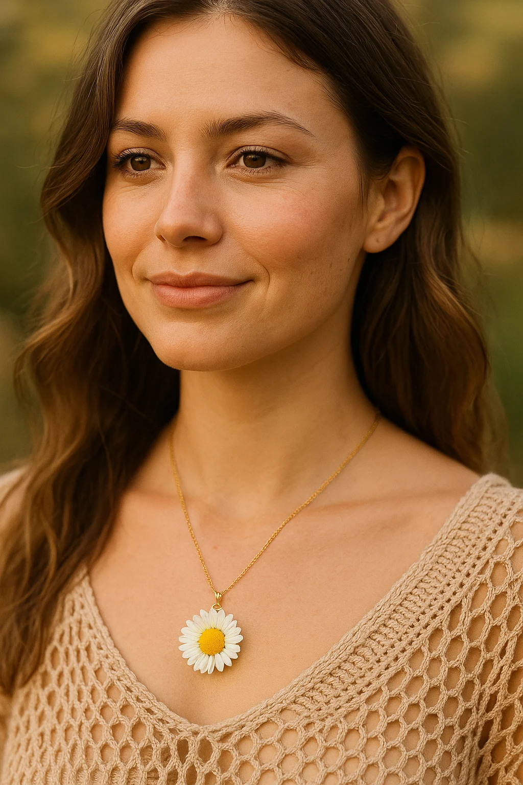 This pendant is designed for people who enjoy simple, soft and elegant jewellery. Because it contains a real flower, each piece is unique. No two daisies grow the same, and therefore your pendant becomes a rare natural keepsake. The resin used is premium quality, and the golden chain adds a warm and classy finish.